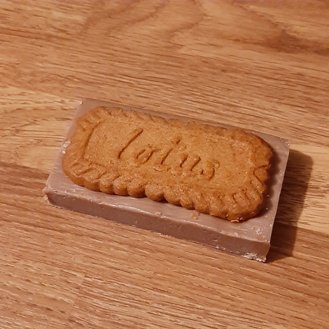 Plain fudge with a Biscoff biscuit, presented in a gift bag.