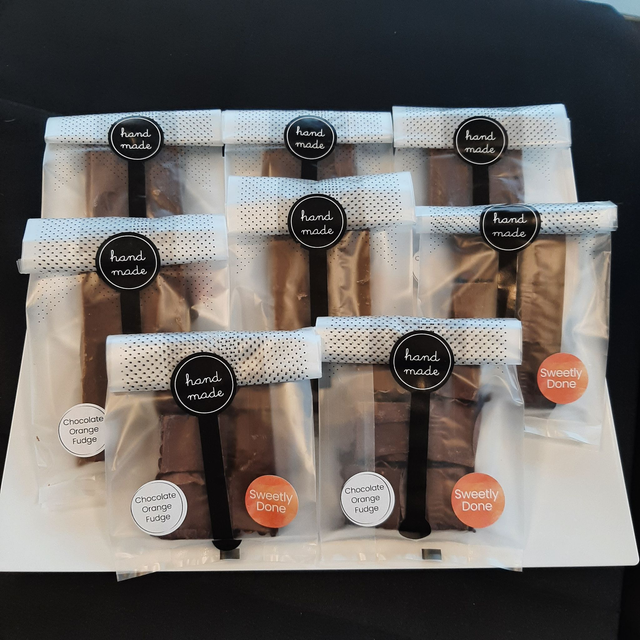 Three gift bags, each containing six pieces of individually wrapped Chocolate Orange fudge.